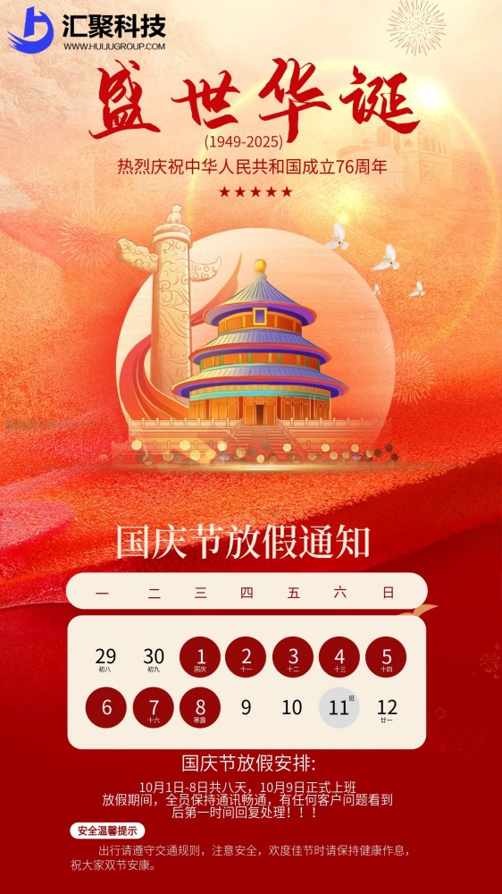 关于我司2025年国庆节放假做如下: 一、放假时间: 10月1 日(周三) 至10月8日(周三)放假,共计8 天。 10月9日(周四)正常上班。 二、注意事项: 1.请大家做好节前工作安排,放假期间保持手机畅通,有任何客户问题第一时间回复处理! 祝大家国庆节快乐!